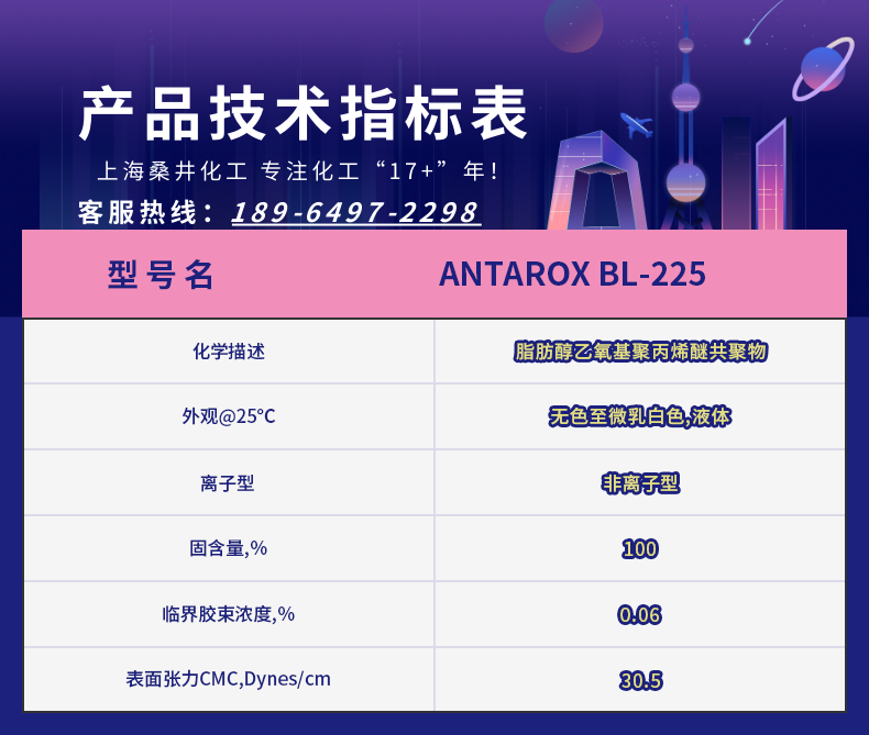 ANTAROX BL-225是非离子润湿乳化剂,具有耐高温,可生物降解的润湿乳化剂。