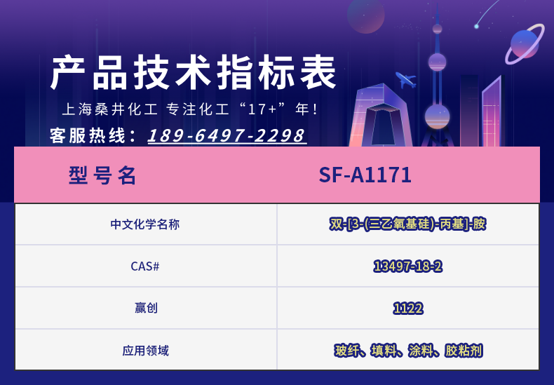 中文化学名称 双-[3-(三乙氧基硅)-丙基]-胺 应用领域 玻纤、填料、涂料、胶粘剂