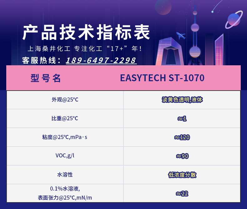 ST-1070是一款聚醚改性硅氧烷共聚物混合物,低动态张力和静态张力,低泡或无泡倾向。ST-1070具有很好的动静态张力降低能力,快速铺展能力,同时并能赋予配方很好的流动性,和大多底材具有低的接触角表现,特别是在木材,玻璃,金属等底材中应用。ST-1070不但可以用于水性体系中,也可以用于EB和UV固化以及溶剂型体系中。通常在这些配方中被做为润湿剂和流平剂使用,和传统有机硅类润湿流平剂相比,ST-1070不会有难以控制的泡沫困扰。