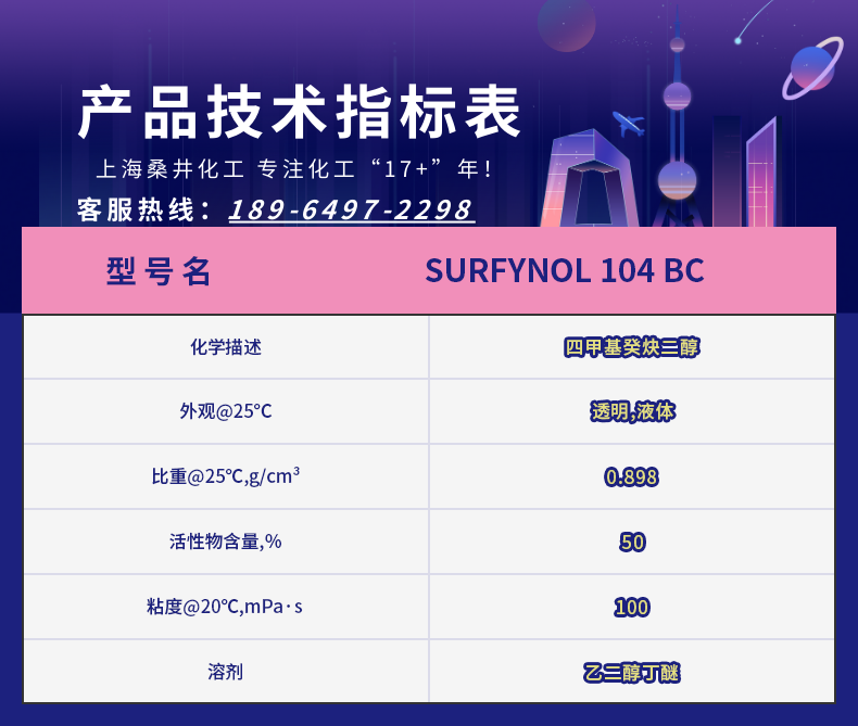 SURFYNOL 104BC是一支炔二醇表面活性剂,它是 50%SURFYNOL 104和50%乙二醇丁醚配置而成的,属于双子型非离子表面活性剂。它具有动态润湿与分子消泡性能。