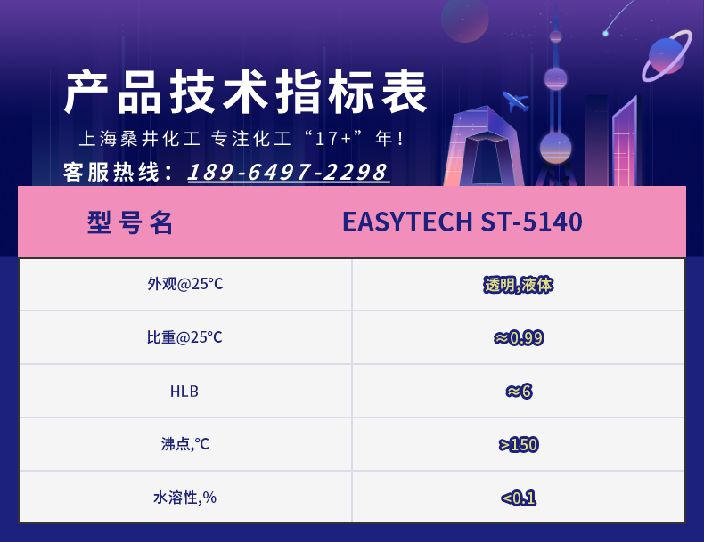 EASYTECH ST-5140是一支非离子型表面活性剂,EASYTECH ST-5140主要用于润版液配方中。